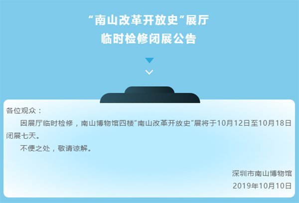 近日,深圳南山博物館發(fā)布通告,因展廳臨時(shí)檢修,南山博物館四樓“南山改革開(kāi)放史”展將于10月12日至10月18日閉展七天。